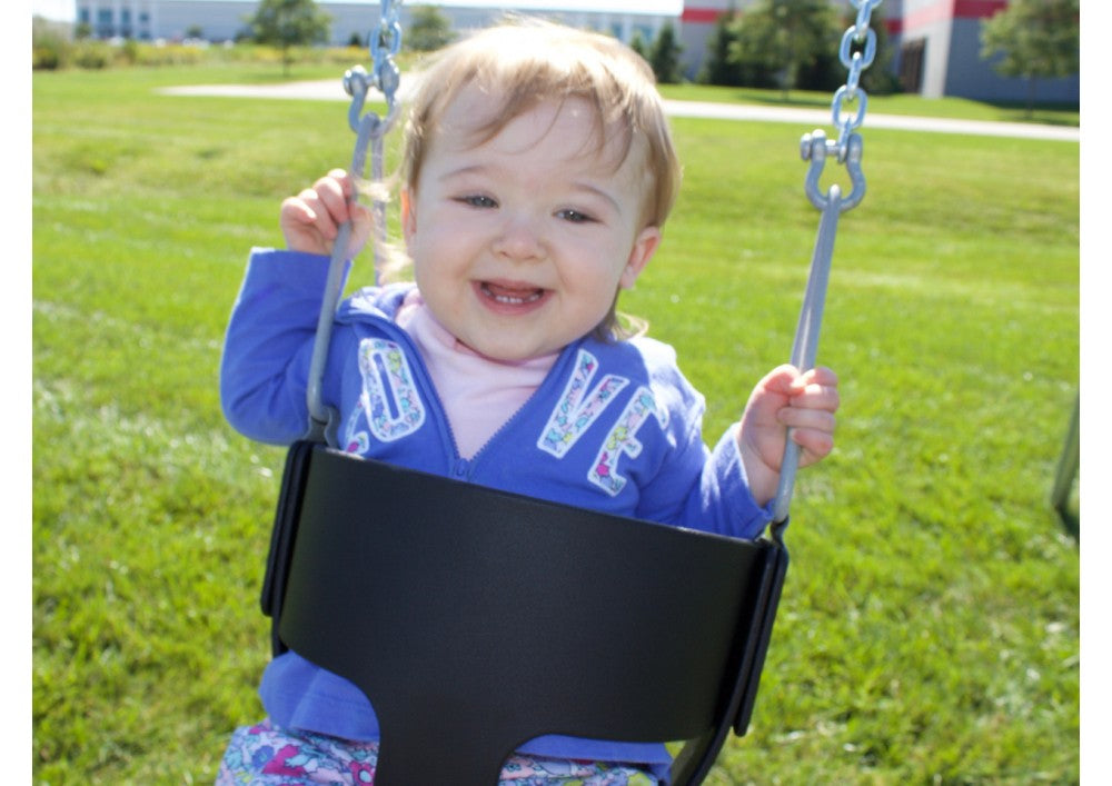 The Elite High Back Bucket Seat is specially designed to keep infants and toddlers as safe as possible while they are introduced to swinging. Its ergonomic shape keeps the rider in a well-supported upright position, eliminating the possibility of them tipping over or falling out. The seat has a steel insert which makes it incredibly durable and rigid, offering additional support and reducing the likeliness of the seat being damaged. Young children will need assistance getting in and out of the seat, and will probably need a push to help them get moving. Still, they will likely appreciate the experience and want to swing even more as they get older. The seat has two metal loops on either side of it which make it easy to attach it to the swing chains. The seat can me ordered in black, blue, and green colors, so that you can match it with the theme of the rest of your playground.