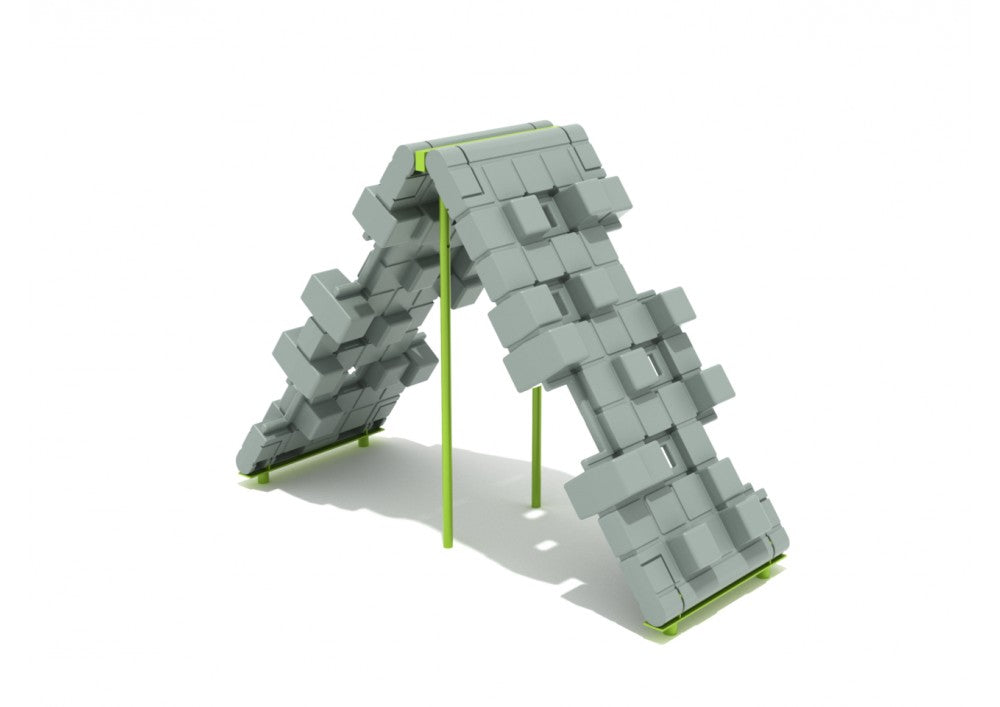 The Pixel Bridge is a simple climber with a prominent shape that kids will notice from all over the playground. Its arched design allows kids to play underneath it or climb up and over the top side. The slanted angle of the pixel climbers makes them easier to scale than vertical climbing walls and allows children to easily climb from one side to the other after reaching the crest of the arch. Imaginative kids making this journey can pretend that they are crossing a bridge or even climbing a steep mountain. From on top of the structure they will have an elevated vantage point from which they can see all of their surroundings. Climbing the undersides of these panels is a fun challenge where children can hang from the holes and edges. The Pixel Bridge offers a surprising number of ways to play in one versatile structure.