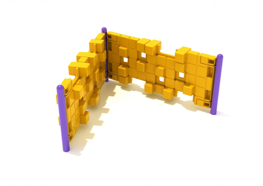 The Pixel Fallen Bridge is another great climbing structure that uses pixel climbers to create a fun playground climbing structure. This model is similar to the Pixel Fallen Bridge, but laid on its side instead of upright. This drastically lowers the overall height of the structure. This makes it significantly safer without reducing the overall area of climbing surfaces. Instead of climbing up and down tall heights, children can climb horizontally across the whole structure, just a few feet above the ground. They can try to challenge themselves by climbing around the corner and edges of the climber without touching the ground. They can even climb over the top of the wall to get from one side to the other. The angled wedge creates a small shelter for kids to hide behind. Children will find no shortage of ways to play with the Pixel Fallen Bridge.